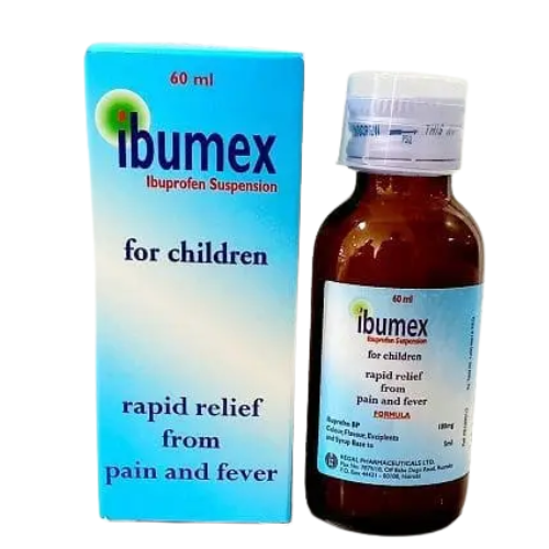 Ibumex Ibuprofen Suspension is a pediatric analgesic and antipyretic formulated to provide rapid relief from pain and fever in children. Each 5 ml of this orange-flavored suspension contains Ibuprofen B.P. 100 mg, making it effective for managing mild to moderate pain, including headaches, toothaches, sore throats, and muscle aches. It also helps reduce fever associated with common childhood illnesses.