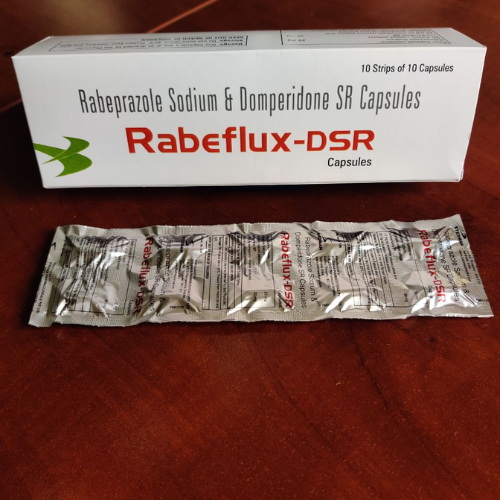 Each pack contains 10 strips of 10 capsules, making it suitable for both short-term and maintenance therapy. Rabeflux-DSR is commonly prescribed for patients experiencing persistent acidity, delayed gastric emptying, or nausea associated with acid-related conditions. The sustained-release formulation ensures prolonged symptom control and improved patient compliance.